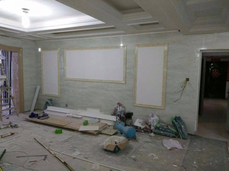 在安裝過程中要注意墻板紋飾顏色是否一致,保持分隔線一致、順暢,不可錯亂,否則會拉低整個電視背景墻的美觀度。安裝好后對拉縫處安裝壓條,增強裝飾效果。