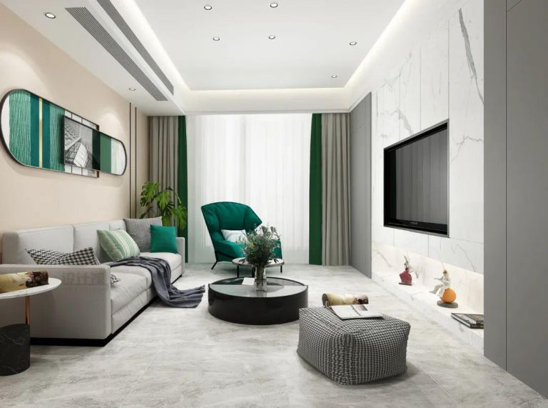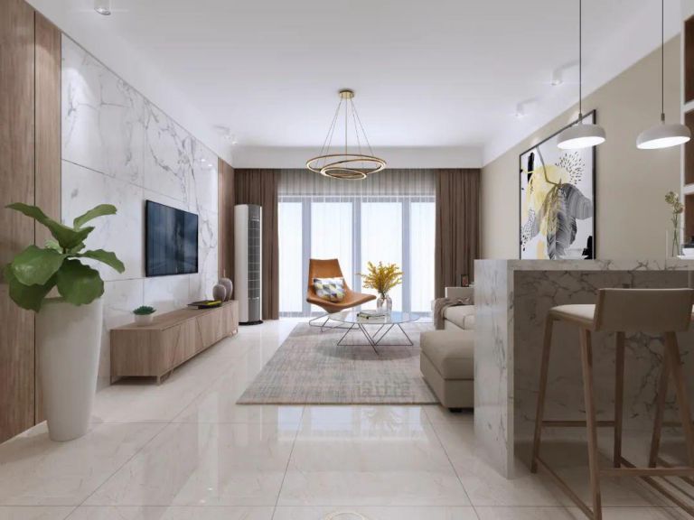 在比較現(xiàn)代風的空間中,也可以在電視墻加入大理石的背景墻設計,同時在兩側加入對稱的木飾面材質,也可以增加空間的自然舒適,避免大理石質感帶來的單一冰冷感受。